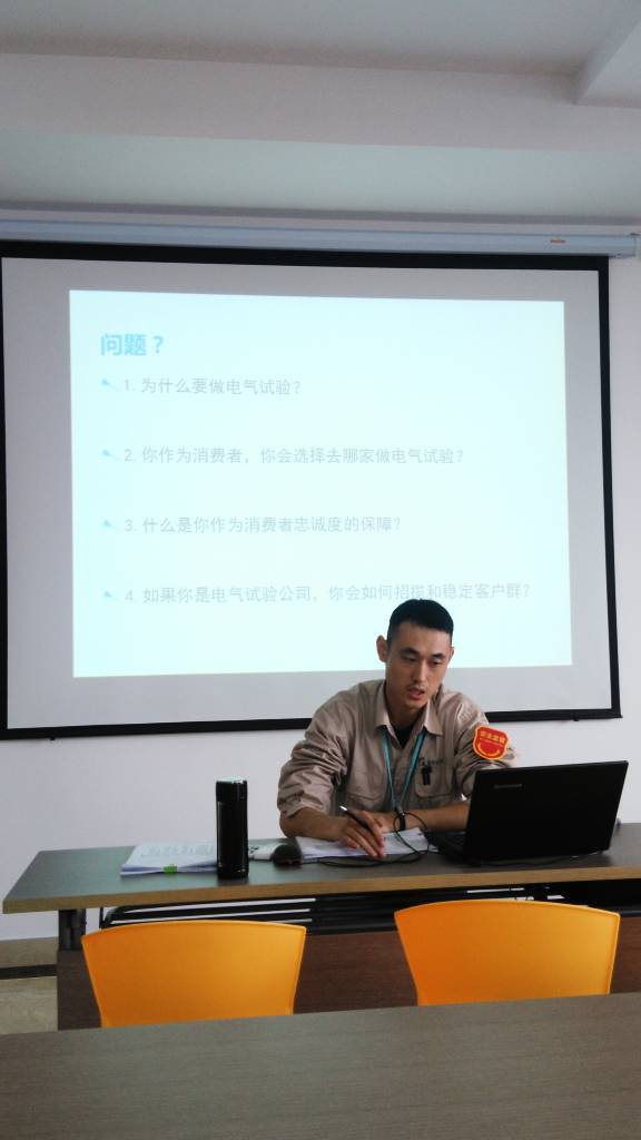 電試班組是公司重要的組成部門,是鑒定安裝工程安全性和正確性的最后把關(guān)部門,培訓過程中分析了電氣試驗的重要性,就安全生產(chǎn)聯(lián)系客戶市場提出了系列發(fā)人深思的現(xiàn)實性問題,灌輸全體電試班組工作人員思想上重視安全、工作中遵規(guī)守紀、實操時循序漸進、強化自身安全責任感的重要理念,培訓中由電試班組領(lǐng)導(dǎo)程英就近期工作開展情況和電試業(yè)務(wù)的操作規(guī)范要求作了報告。